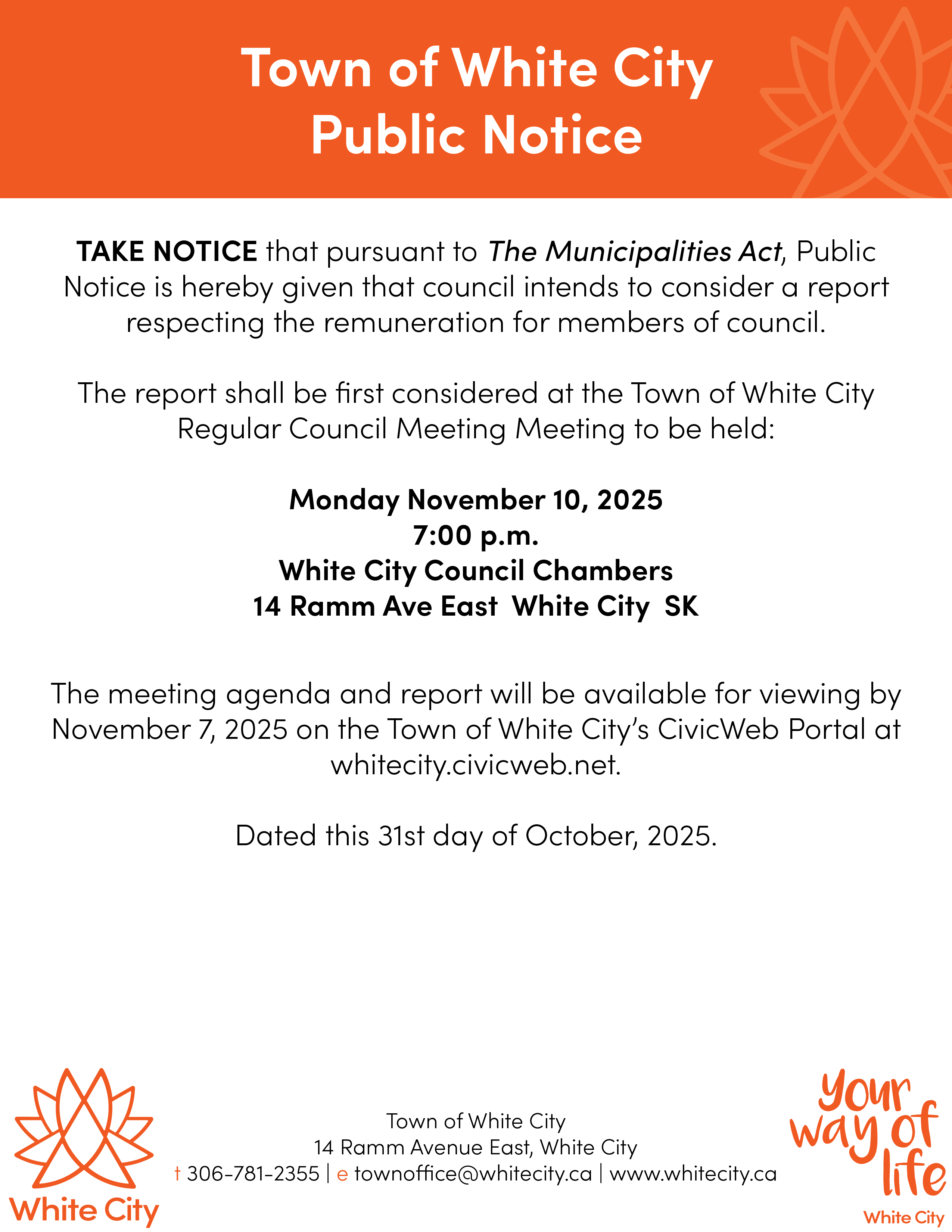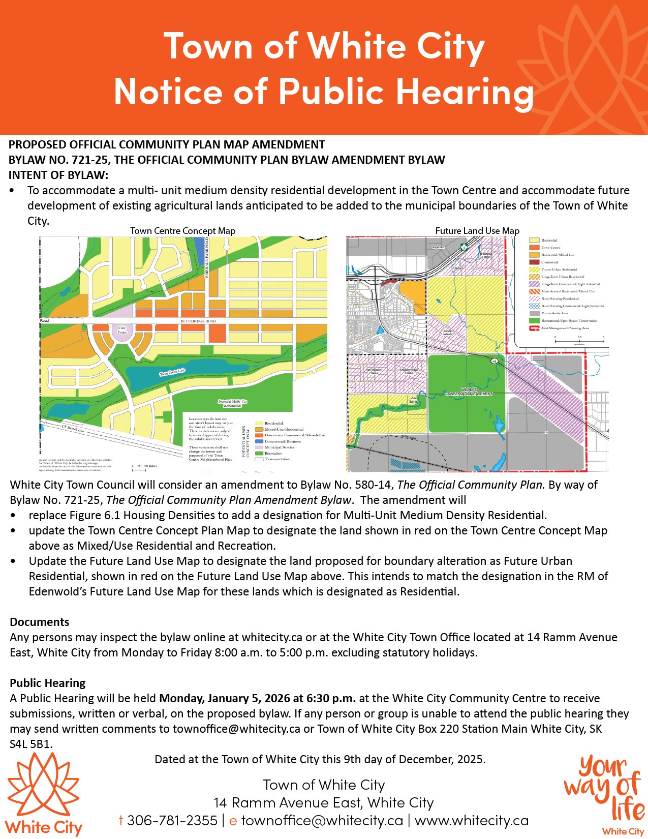 Previous Public Notices can be accessed here. Please note only notices for the previous two years will be accessible here, if you have questions about a prior public notice please e-mail townoffice@whitecity.ca with your request.