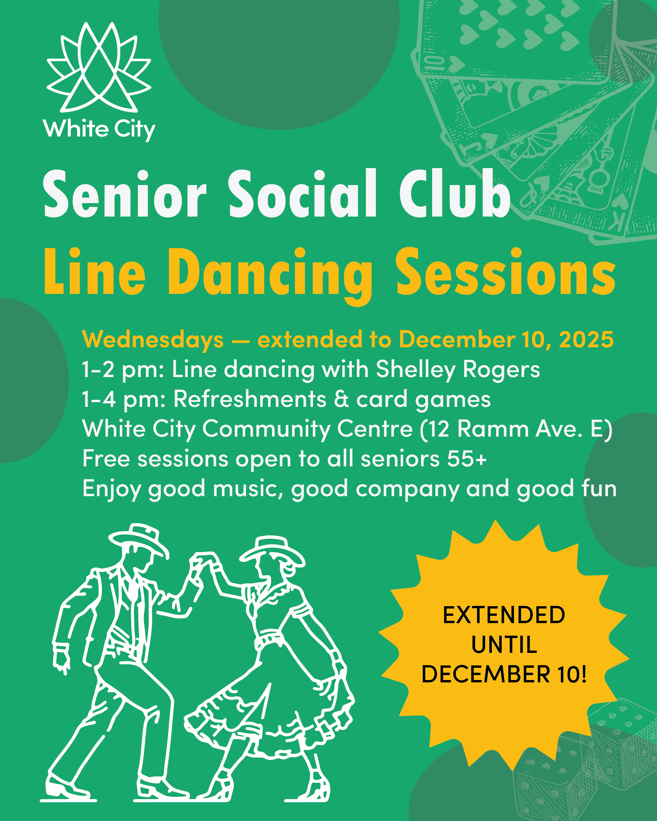 These sessions are free to attend and are open to all seniors 55+ — dancing not required. The club meets at the White City Community Centre (12 Ramm Ave. E).
