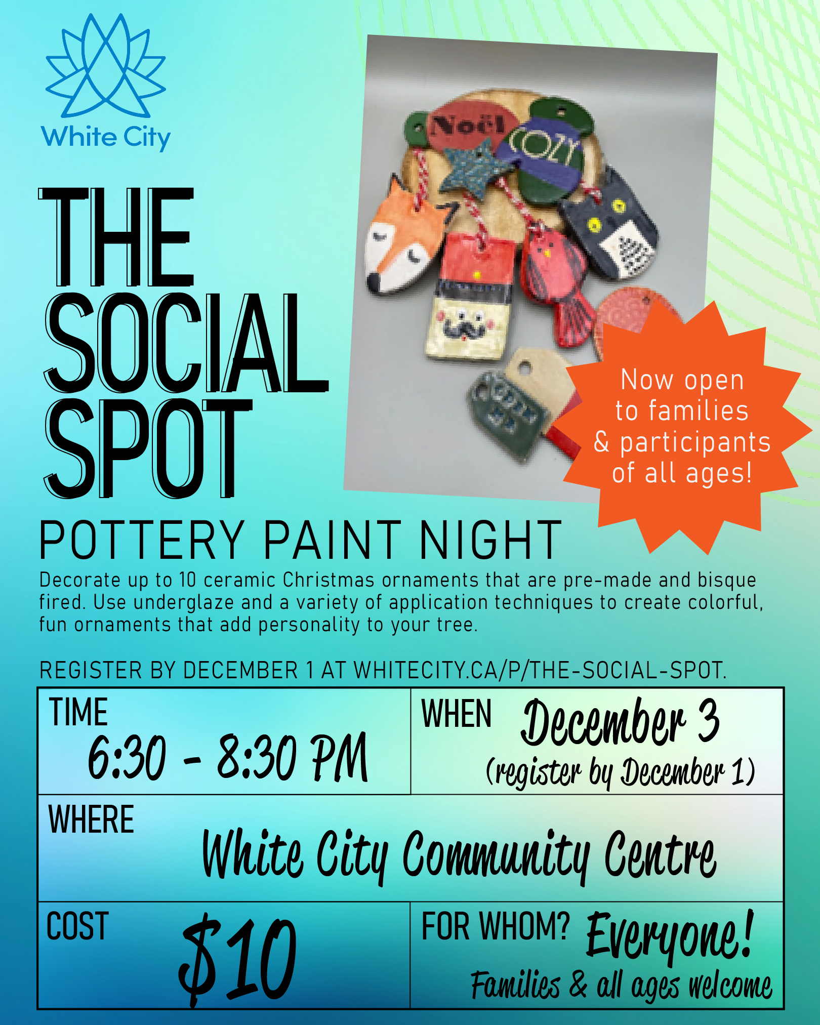 You must register by December 1 at 12:00 pm to participate in Pottery Paint Night. Click here to register.
