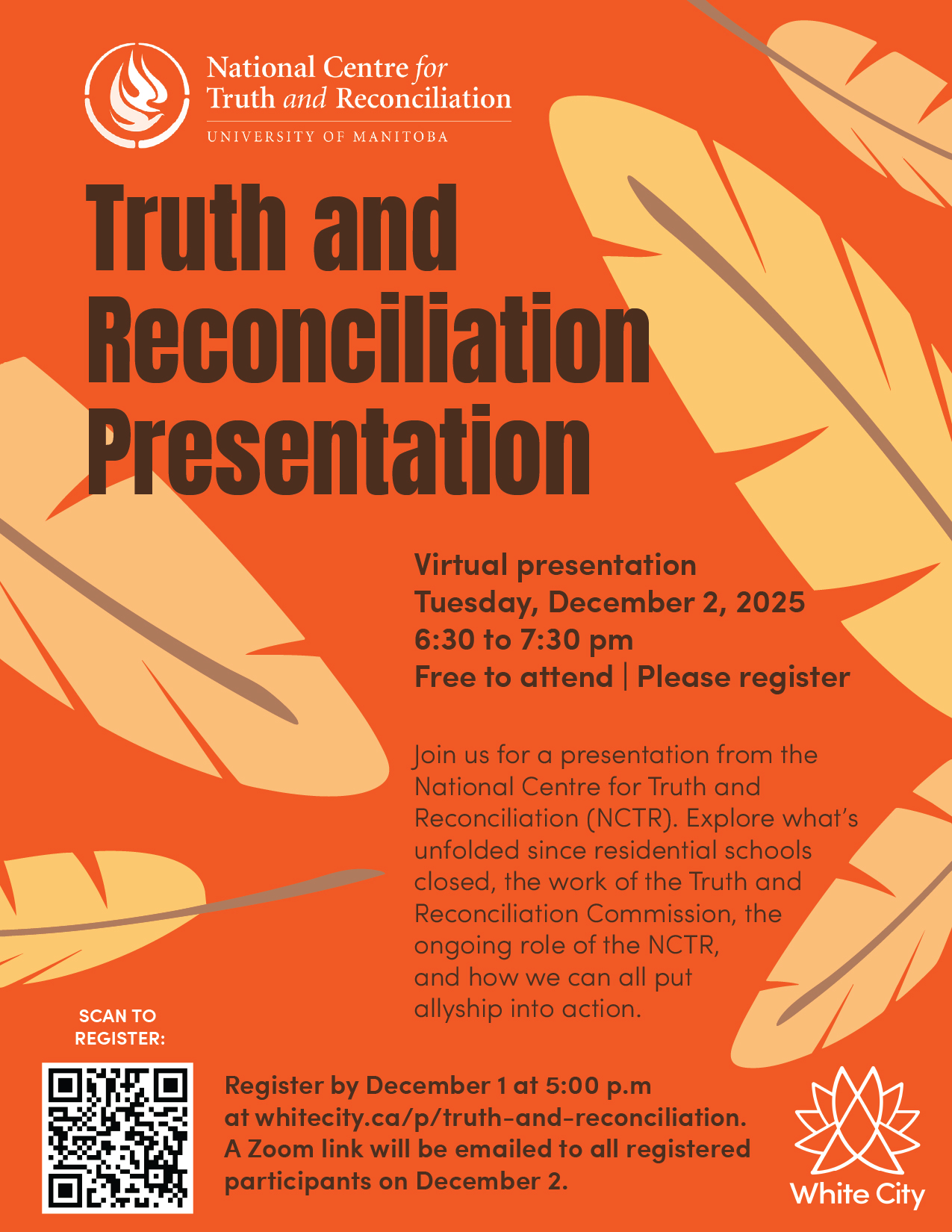 Join the Town of White City and the National Centre for Truth and Reconciliation for this meaningful one-hour presentation. We will explore the path of truth and reconciliation in Canada, including what has unfolded since the closure of residential schools, the work of the Truth and Reconciliation Commission, and the ongoing role of the National Centre for Truth and Reconciliation. We’ll also reflect on where we are today as a nation — and how each of us can put allyship into action in our daily lives.