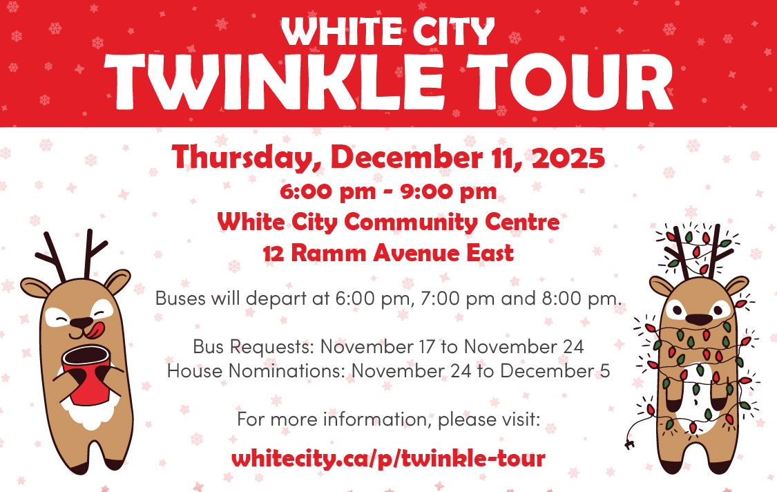 White City's annual Twinkle Tour returns Thursday, December 11, 2025! Join us for a magical evening of dazzling holiday lights, festive fun, and activities for the whole family at the White City Community Centre (12 Ramm Avenue East).