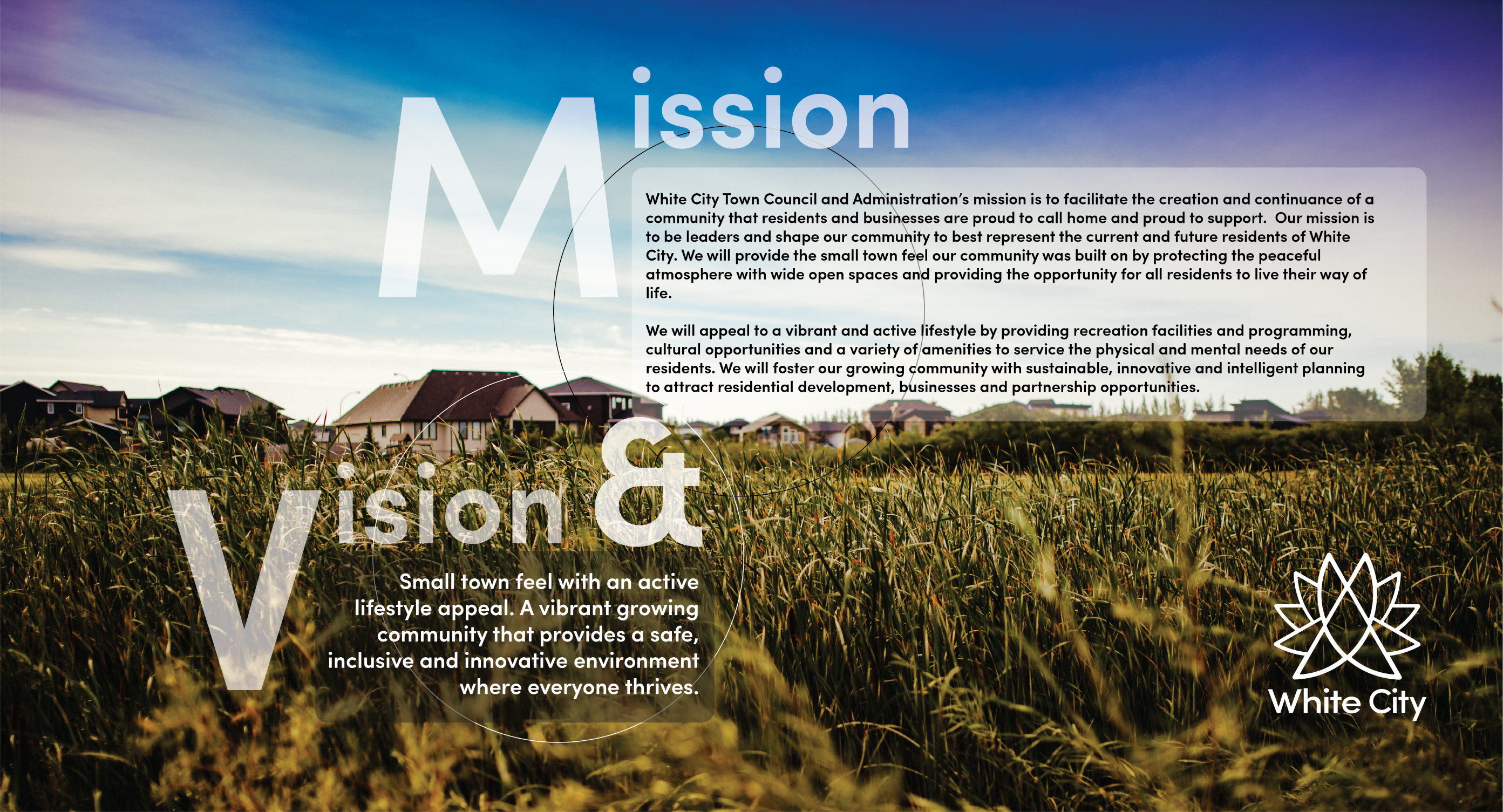 White City Town Council and Administration’s mission is to facilitate the creation and continuance of a community that residents and businesses are proud to call home and proud to support. Our mission is to be leaders and shape our community to best represent the current and future residents of White City. We will provide the small town feel our community was built on by protecting the peaceful atmosphere with wide open spaces and providing the opportunity for all residents to live their way of life.