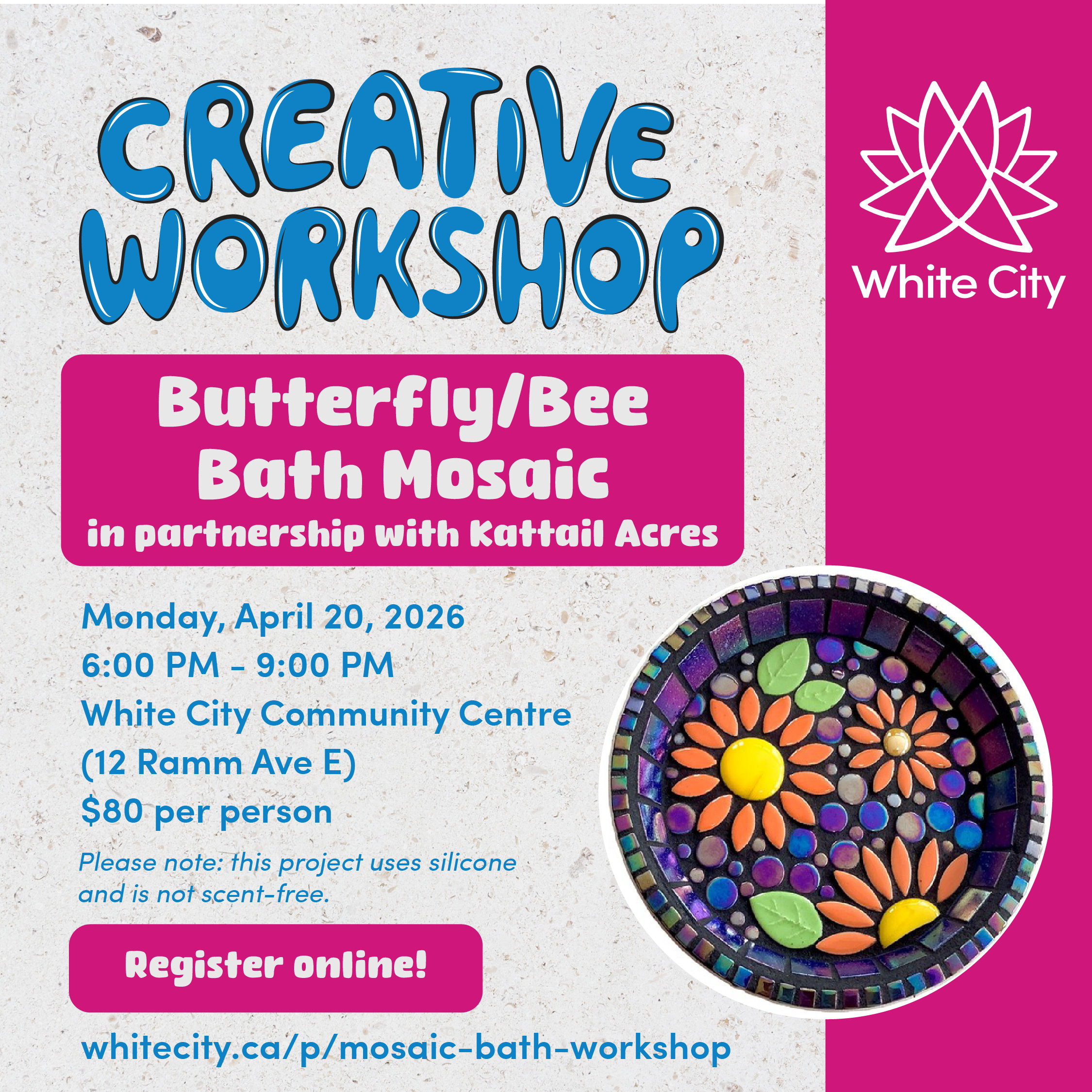 In this class, you'll create a pretty butterfly/bee bath for our insect friends! Use colourful mosaic tile in fun shapes to create a floral pattern in your 9” terra cotta saucer. We’ll be using silicone to make the bath weather and water resistant; please be aware that this is not a scent free project.