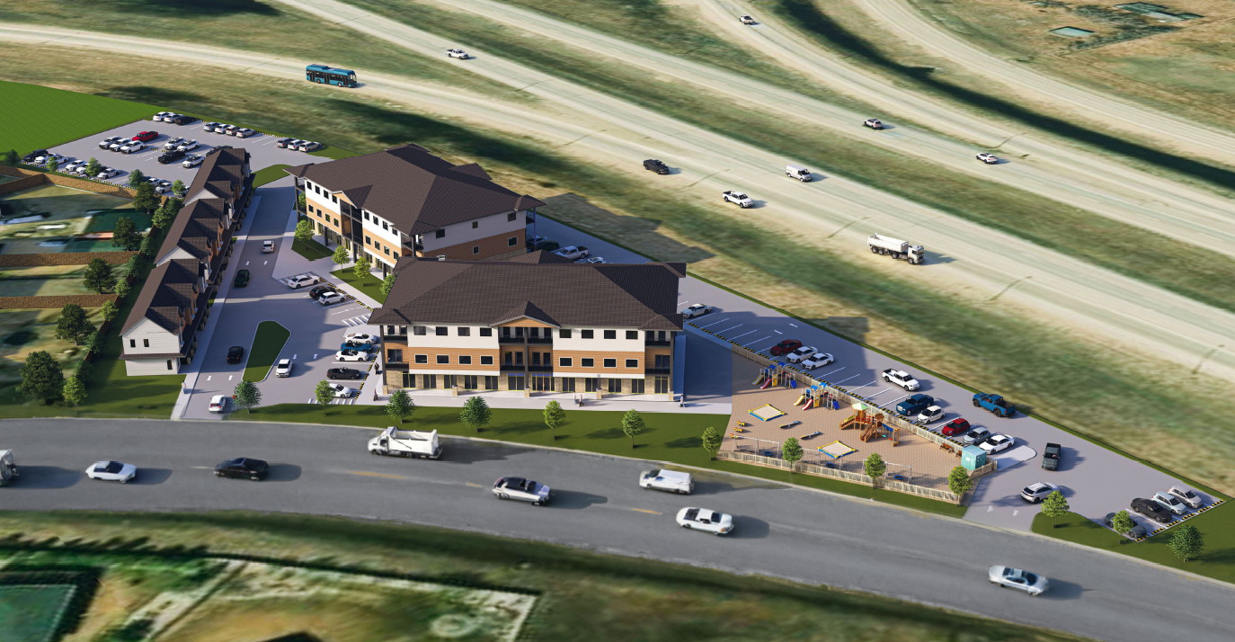 Phase 1: A three-story building with a daycare on the main floor and 20 residential suites on the upper floors.