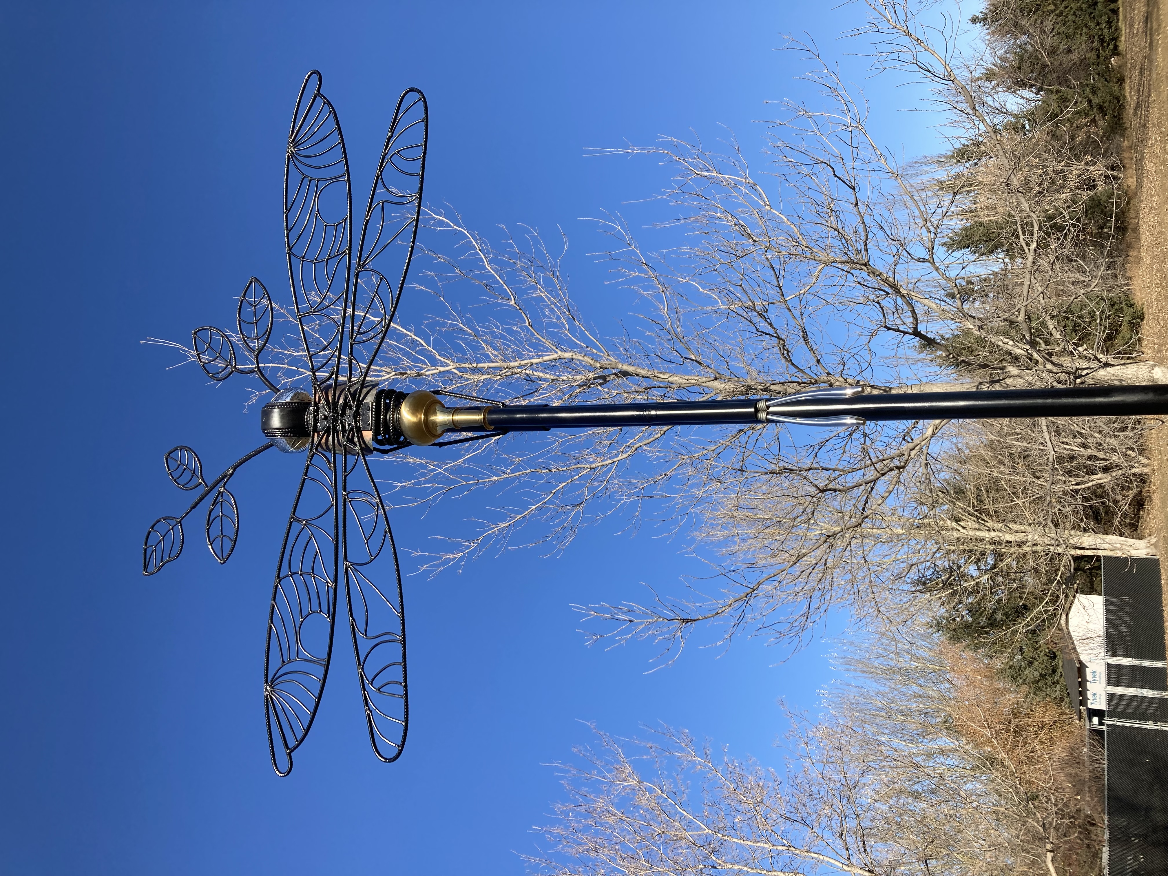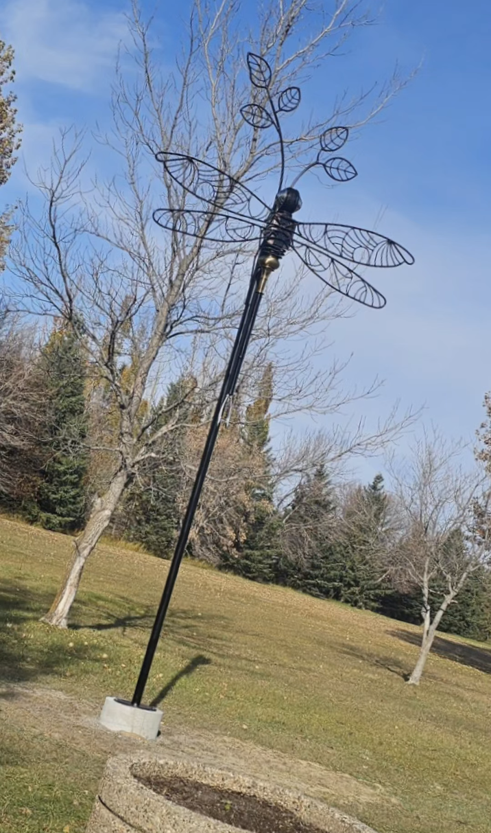 Created by local artist Bruno Van Opstal, this eye-catching sculpture captures the imagination with its elegant form and powerful symbolism. The dragonfly features a 5’5” tall body crafted from a variety of materials, paired with a striking 6-foot wingspan formed from 10mm rebar. The sculpture is meticulously arc-welded and finished with a sleek, rustproof high-gloss black paint for durability.