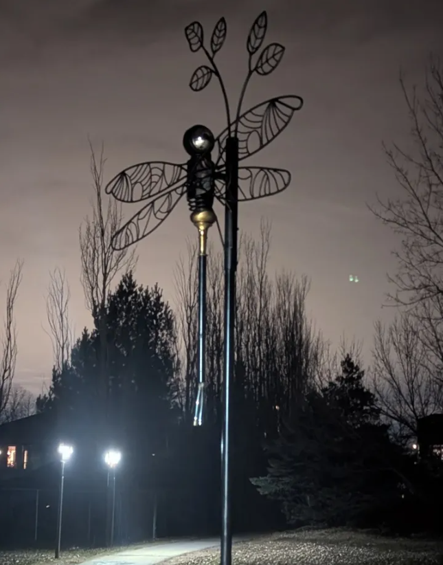 The Town chose to place the dragonfly at Emerald Ridge Park based on public engagement with residents. Through a community survey, many people asked for art to be placed in parks, along pathways, and in high-traffic areas. Emerald Ridge Park was a natural fit: it’s a busy spot where walking paths meet and it’s close to an open green space used for sports, allowing many people to enjoy the sculpture.