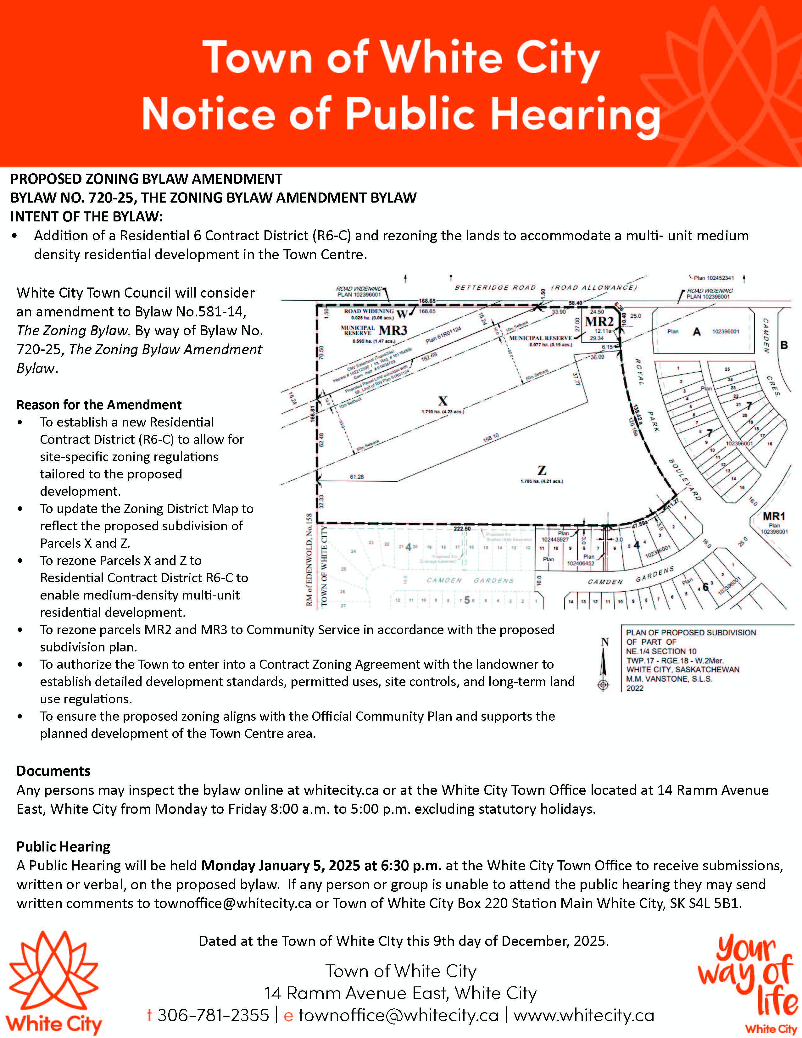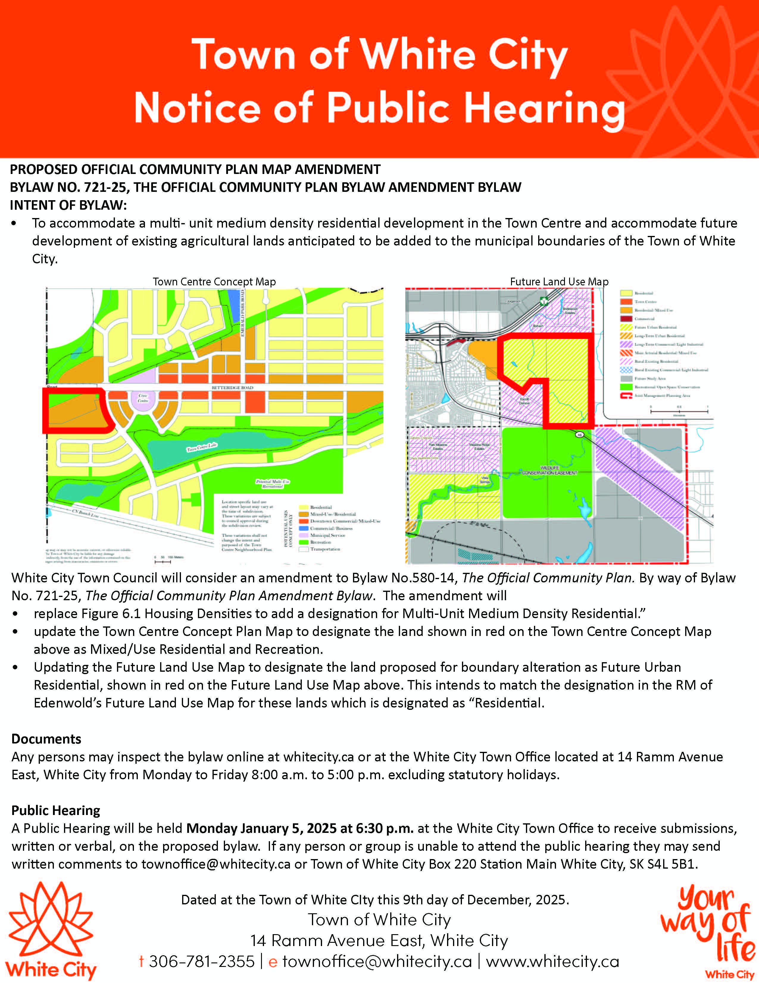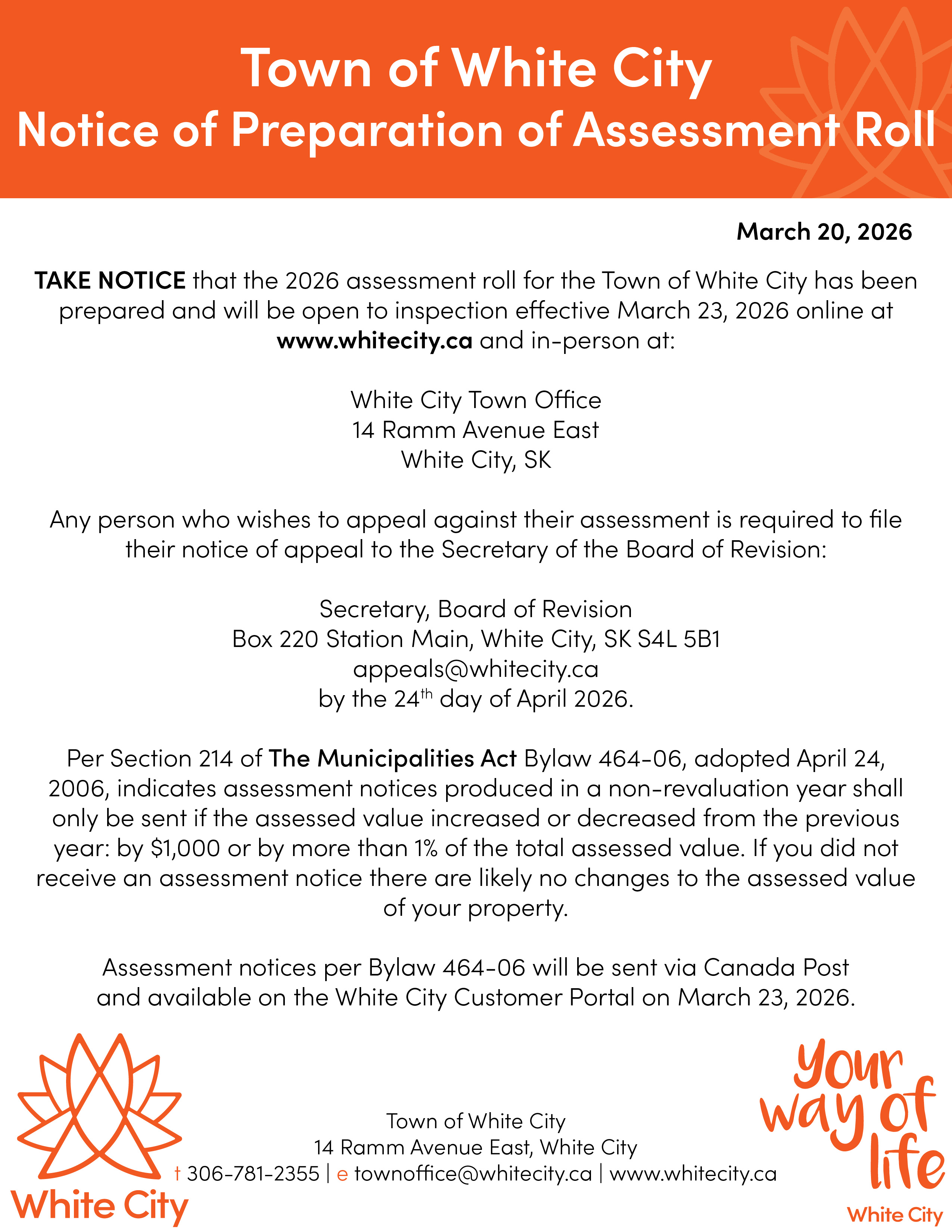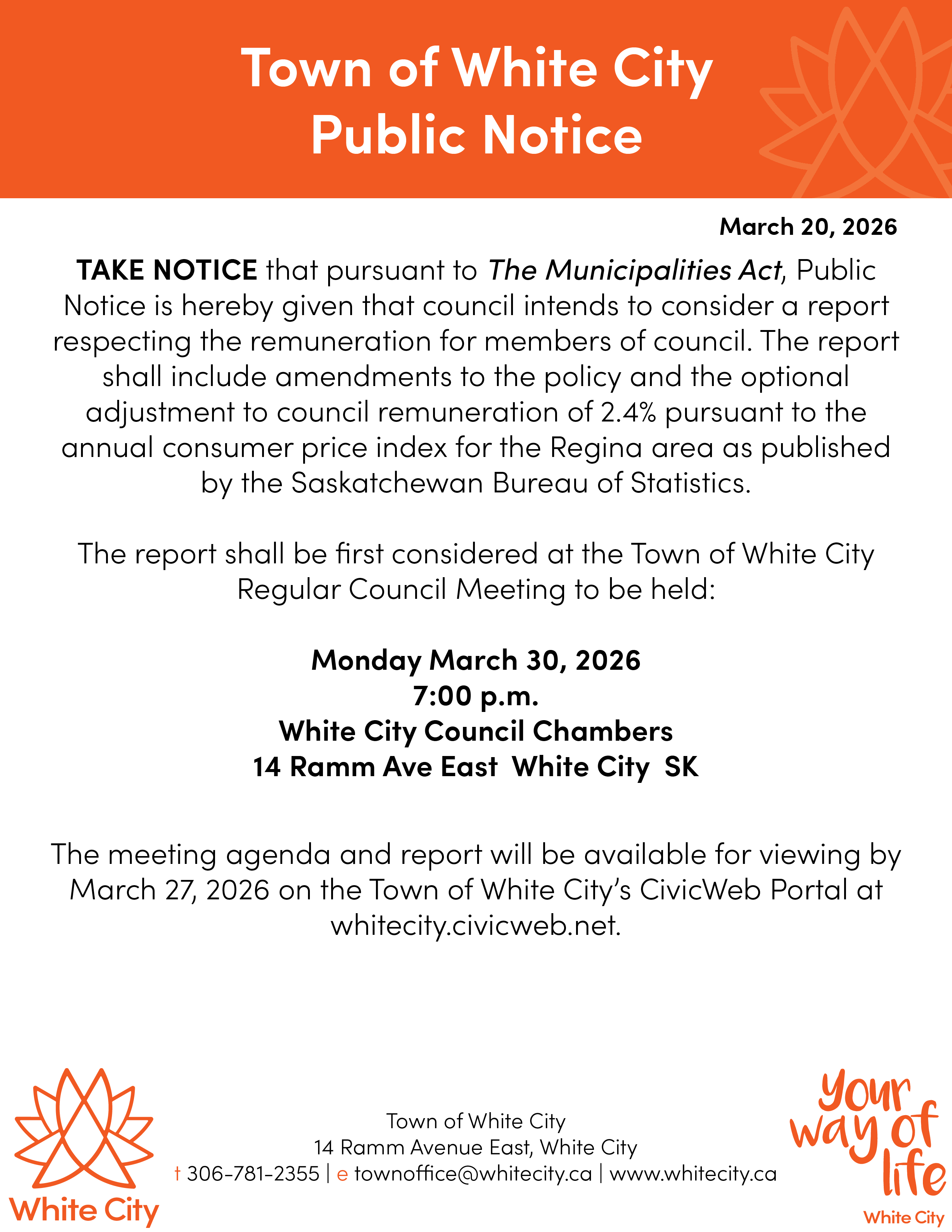 Previous Public Notices can be accessed here. Please note only notices for the previous two years will be accessible here, if you have questions about a prior public notice please e-mail townoffice@whitecity.ca with your request.