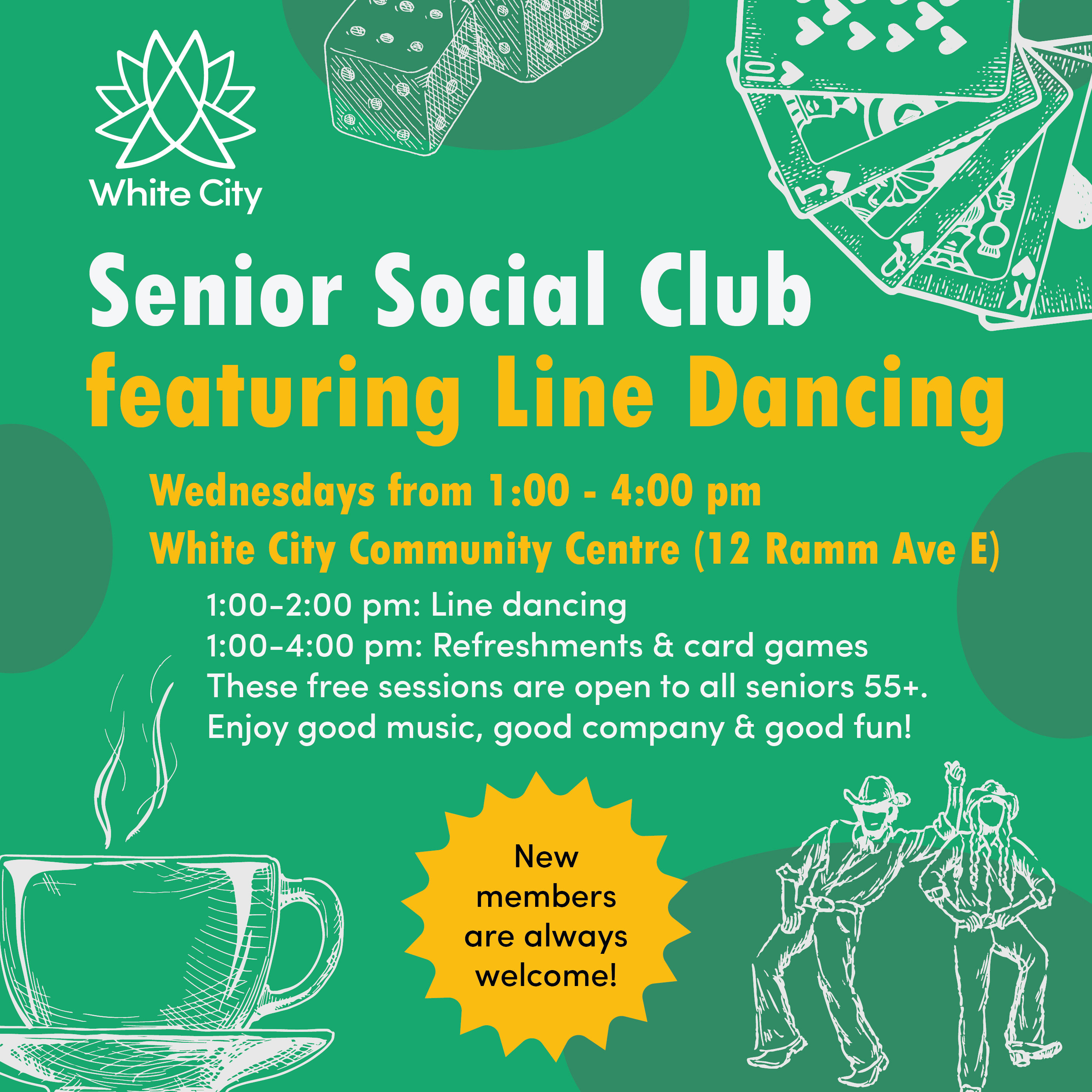 These sessions are free to attend and are open to all seniors 55+ — dancing not required. The club meets at the White City Community Centre (12 Ramm Ave. E).